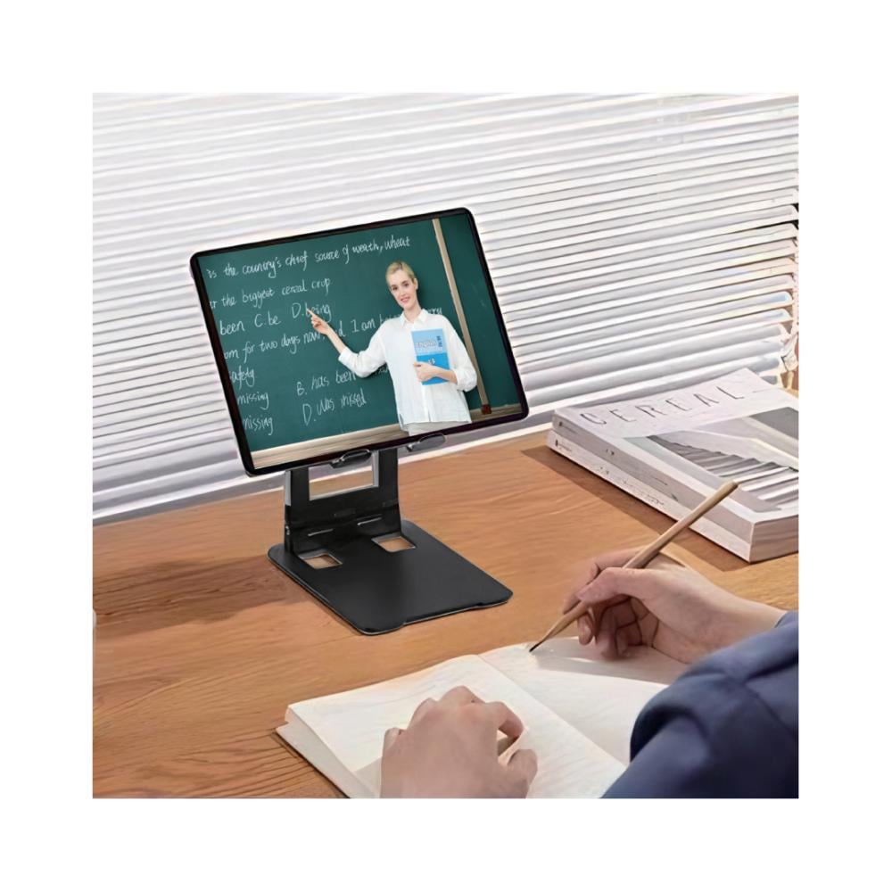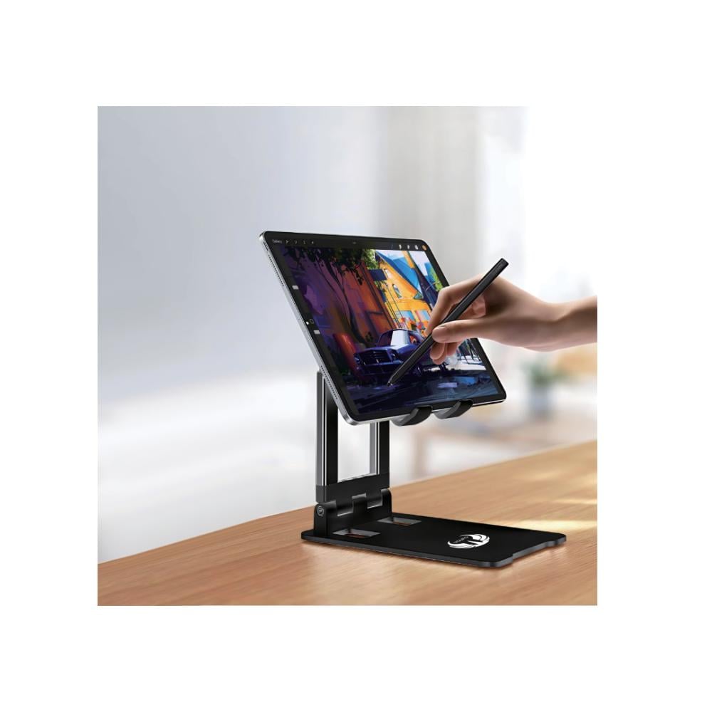 - قاعدة مقاومة للانزلاق: مزودة بوسادات سيليكون لتثبيت التابلت بإحكام وحماية السطح من الخدوش.