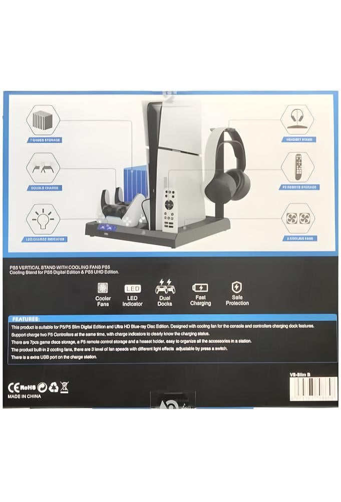 تم تصميم قاعدة الشحن والتبريد متعددة الوظائف لجهاز بلايستيشن 5 (عادي، سليم، برو) لتمنحك تجربة ألعاب أكثر ترتيبًا وراحة. تجمع هذه القاعدة بين شاحن مزدوج لوحدات التحكم، وحامل سماعة الرأس، وحامل أقراص، وحامل لجهاز التحكم عن بعد، مما يساعدك على تنظيم مساحة اللعب وشحن أجهزتك في نفس الوقت. تصميم معدني قوي باللون الأسود يضيف لمسة احترافية لأجواء اللعب.