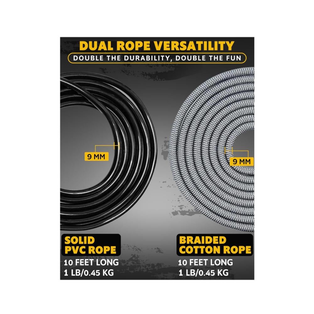 - حبل مزدوج متعدد الاستخدامات - يأتي حبل القفز الفريد الخاص بنا مع حبلين قابلين للتبديل - قطن مضفر 9 ملم وحبل من بلاستيك PVC الصلب 9 ملم. هذا التصميم المزدوج لا يضاعف عمر الحبل فحسب، بل يسمح لك أيضًا بتخصيص التدريبات الخاصة بك، مما يضيف التنوع والتحدي أثناء التبديل بين المواد.