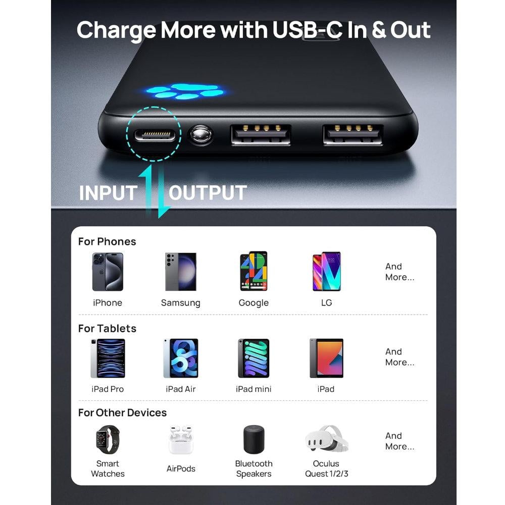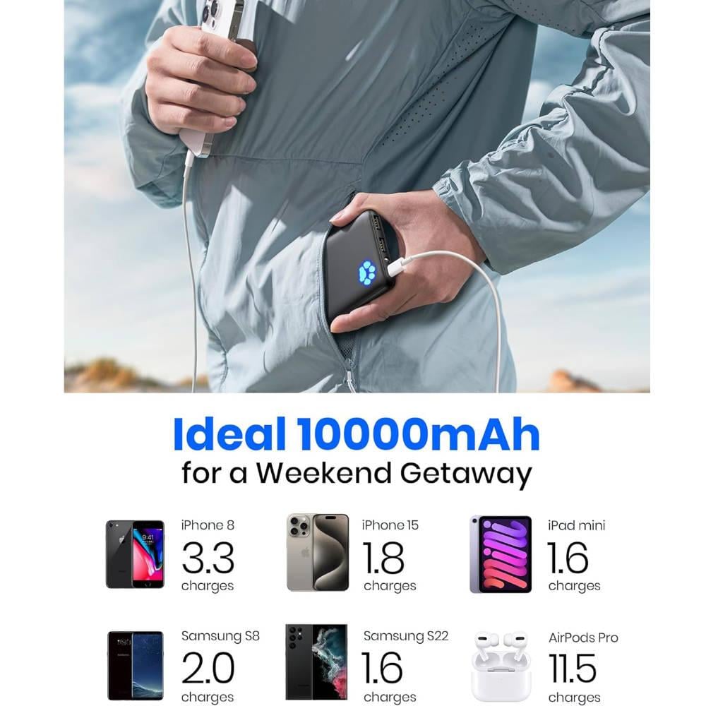 - أنحف 10000 مللي أمبير في الساعة - باور بانك واحد فقط في السوق 0.51 بوصة يكسر الحد الأقصى البالغ 10000 مللي أمبير في الساعة، ينزلق بسهولة في جيوب أو حقيبة أي محب للسفر. استمتع بسعة شحن تدوم لأيام كافية لشحن ايفون 8 3.6 مرة أو سامسونج اس 22 1.8 مرة أو ايربودز برو 13.2 مرة.