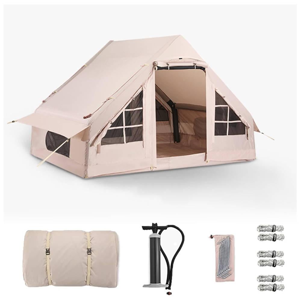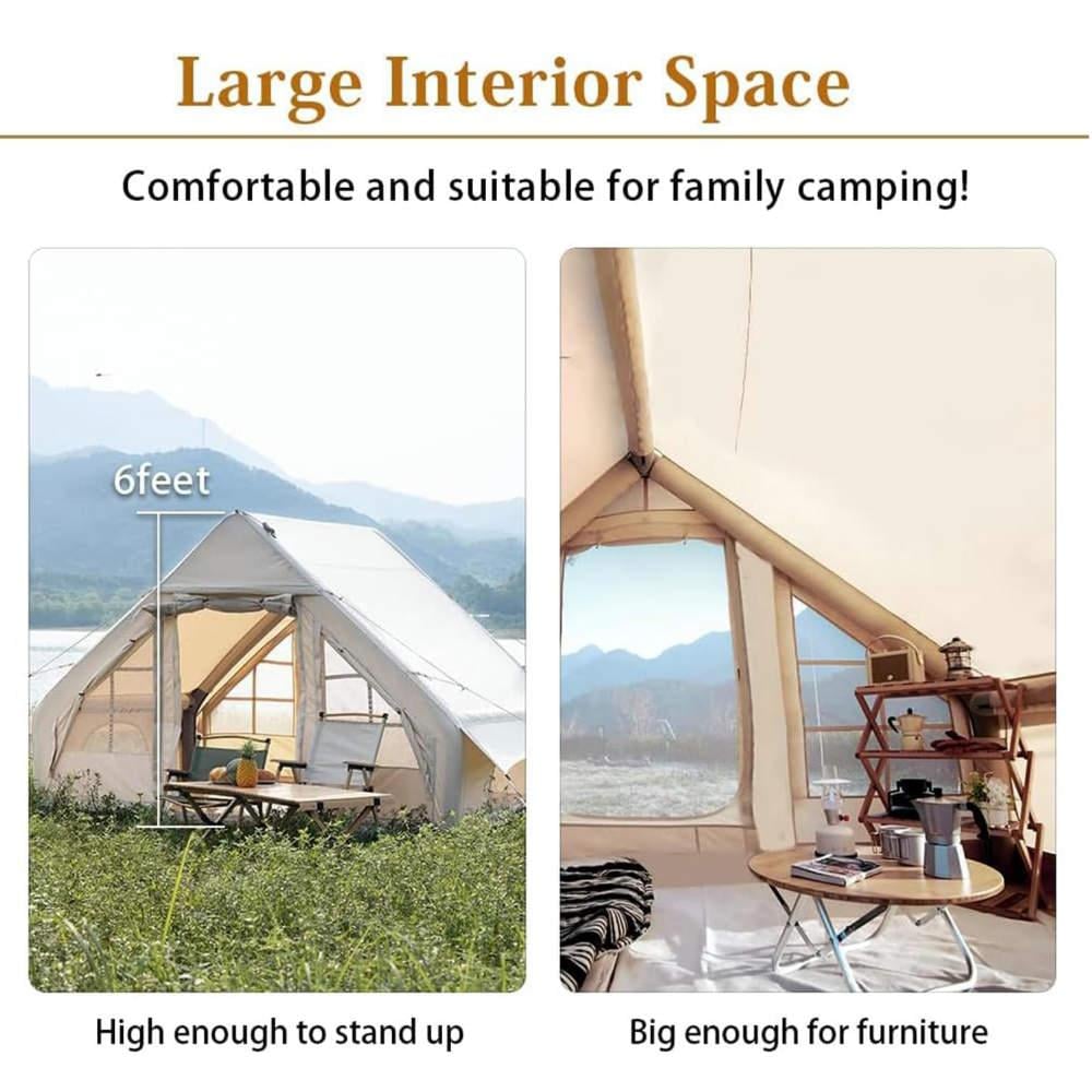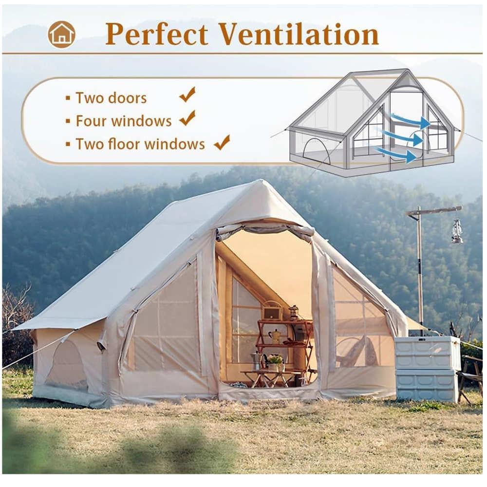 - تهوية ممتازة - تتميز هذه الخيمة القابلة للنفخ على شكل منزل صغير ببابين متماثلين بسحّاب مزدوج لسهولة الدخول من اتجاهات مختلفة، وأربع نوافذ شبكية من طبقتين توفر تهوية ممتازة وتسمح بالخصوصية. وبالتالي فإنها مريحة للاستخدام في الصيف. فضلًا عن أنها تمتاز بسقف مرتفع نسبيًا، لذلك لا داعي للقلق بشأن التكثيف.