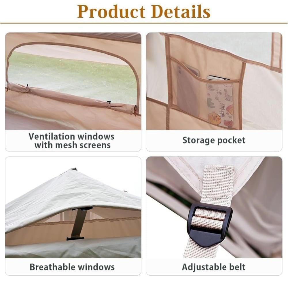 - مادة آمنة ومتينة - تتميز هذه الخيمة المصنوعة من قماش أكسفورد 300D عالي الكثافة بخصائص مقاومة للماء والأشعة فوق البنفسجية، لتتمكن من الاستمتاع في الأماكن الخارجية دون القلق بشأن الرياح والأمطار، مع مؤشر مقاومة الماء PU5000 ملم. أما بالنسبة لأعمدة الهواء، فإننا نستخدم مادة البولي يوريثين الحراري، وهي أفضل من بلاستيك PVC، حيث أنها أكثر أمانًا ومتانة. فعند نفخ أعمدة الهواء، بإمكانك سحب حبل الرياح كإجراء إضافي لتثبيت الخيمة.