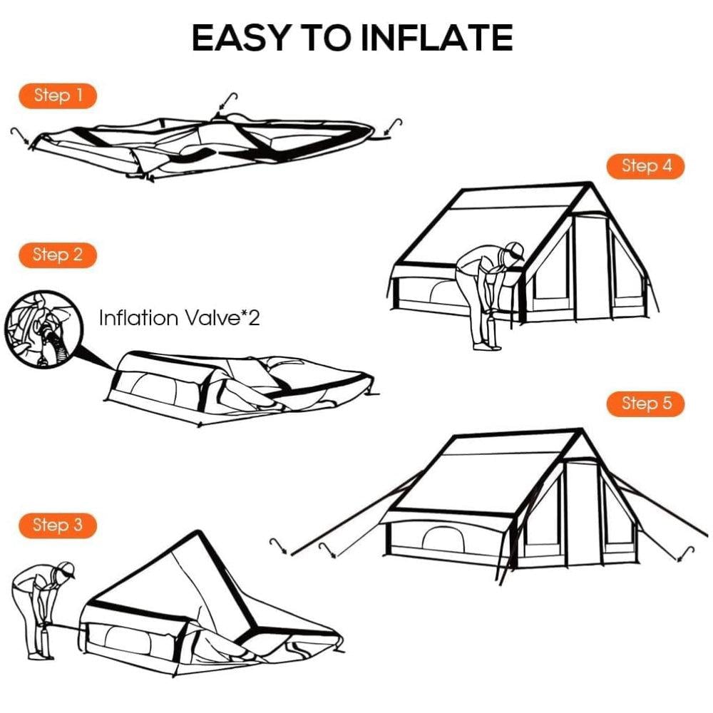 - سهلة التركيب - صُممت هذه الخيمة بأعمدة هواء قابلة للنفخ وتتضمن مضخة، إلى جانب مدخلين للهواء على الخيمة، ما عليك سوى ضخ الهواء يدويًا عبر كلا المدخلين، مع التأكد من إغلاق المنفذ الآخر بإحكام أثناء النفخ لتتمكن من نصب الخيمة بسرعة في 5 دقائق. حيث بإمكانك إعدادها بسهولة شديدة مقارنةً بالخيمة ذات الأعمدة العادية.