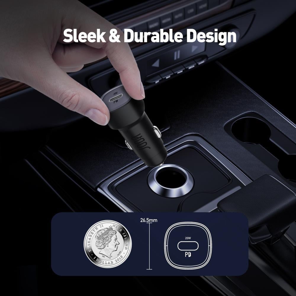 - تصميم مدمج: حجمه الصغير يسمح بتركيبه بسهولة في منفذ ولاعة السيارة دون شغل مساحة كبيرة.