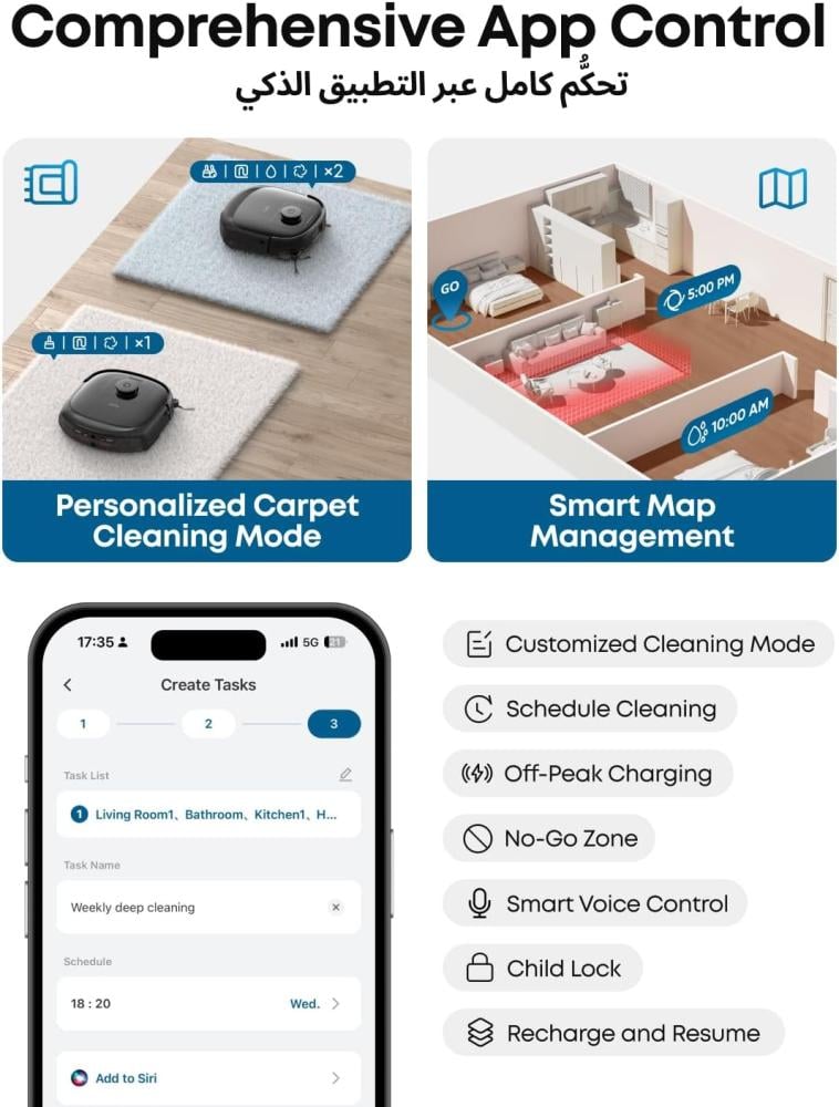 - خرائط ذكية وتحكم كامل: تخصص الغرف، تحدد مناطق ممنوعة أو مناطق مسح فقط، وتدير كل شيء من جوالك.