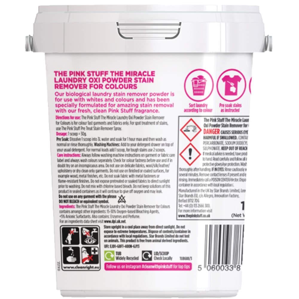 - مسحوق مزيل البقع The Pink Stuff The Miracle Laundry Oxi Powder Stain Remover for Colours مخصص للملابس والأقمشة التي لا تتغير ألوانها إلا بعد استخدامه. لإزالة البقع الموضعية، استخدم بخاخ مزيل البقع The Pink Stuff Pre Treat. الجرعة: ملعقة واحدة = 30 جرامًا. النقع المسبق: قم بإذابة ملعقة واحدة في 3 لتر من الماء وانقعها لمدة ساعة كحد أقصى ثم اغسلها كالمعتاد أو اشطفها جيدًا. الغسالات: أضفها إلى درج المنظفات فوق المنظفات المعتادة. للغسيل العادي، أضف ملعقة واحدة، وللبقع الصعبة استخدم ملعقتين.
