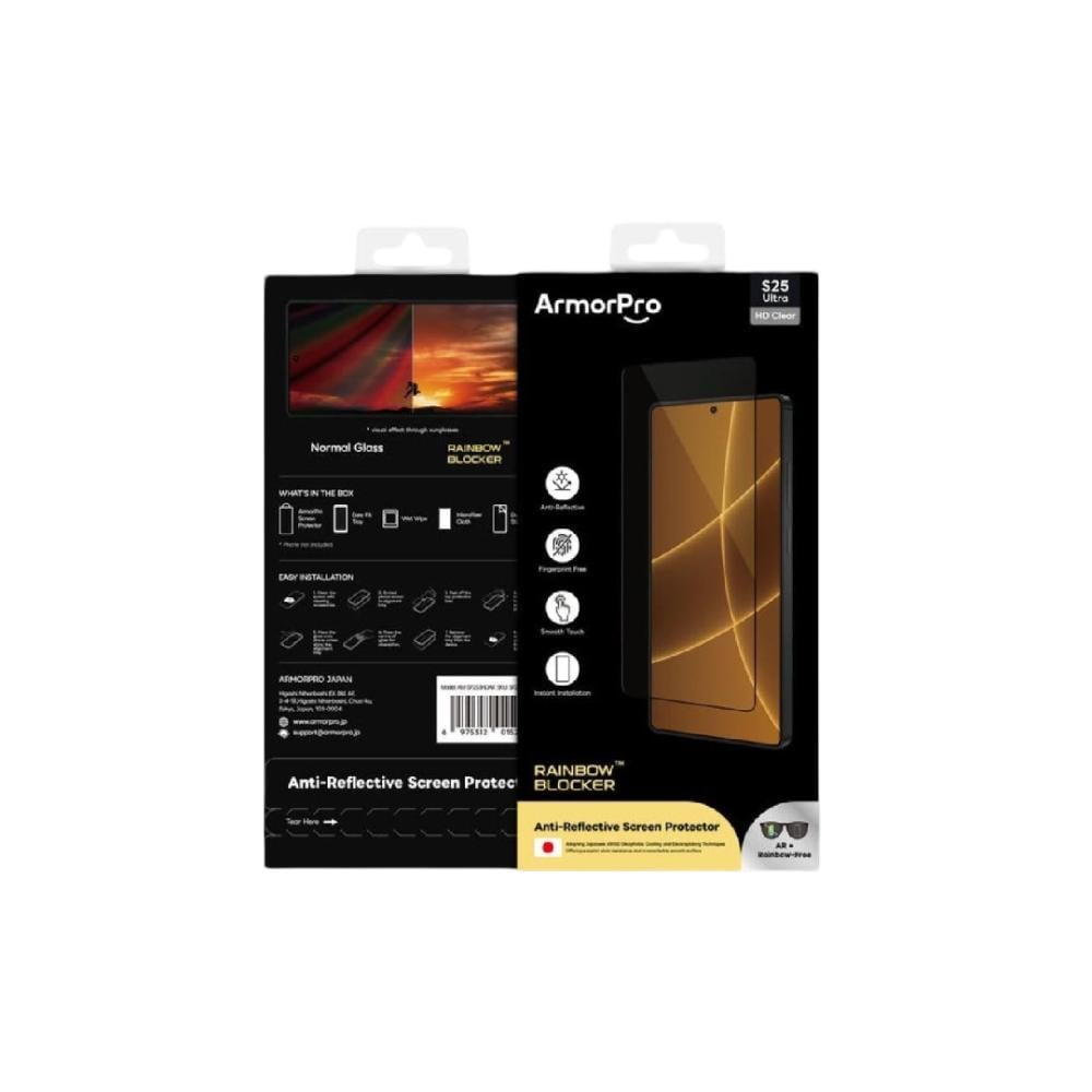 ArmorPro RainbowBlocker Screen Protector HD AR + Anti-Glare for Samsung S25Ultra هو واقي شاشة متقدم صُمم خصيصًا للجمع بين تقنيات مضادة للانعكاس (HD AR) وتقليل الوهج (Anti-Glare)، إلى جانب خاصية RainbowBlocker التي تمنع التموجات اللونية المزعجة. يهدف هذا المنتج إلى توفير تجربة مشاهدة فائقة الوضوح وحماية موثوقة لشاشة هاتف Samsung S25Ultra من الخدوش والصدمات اليومية.