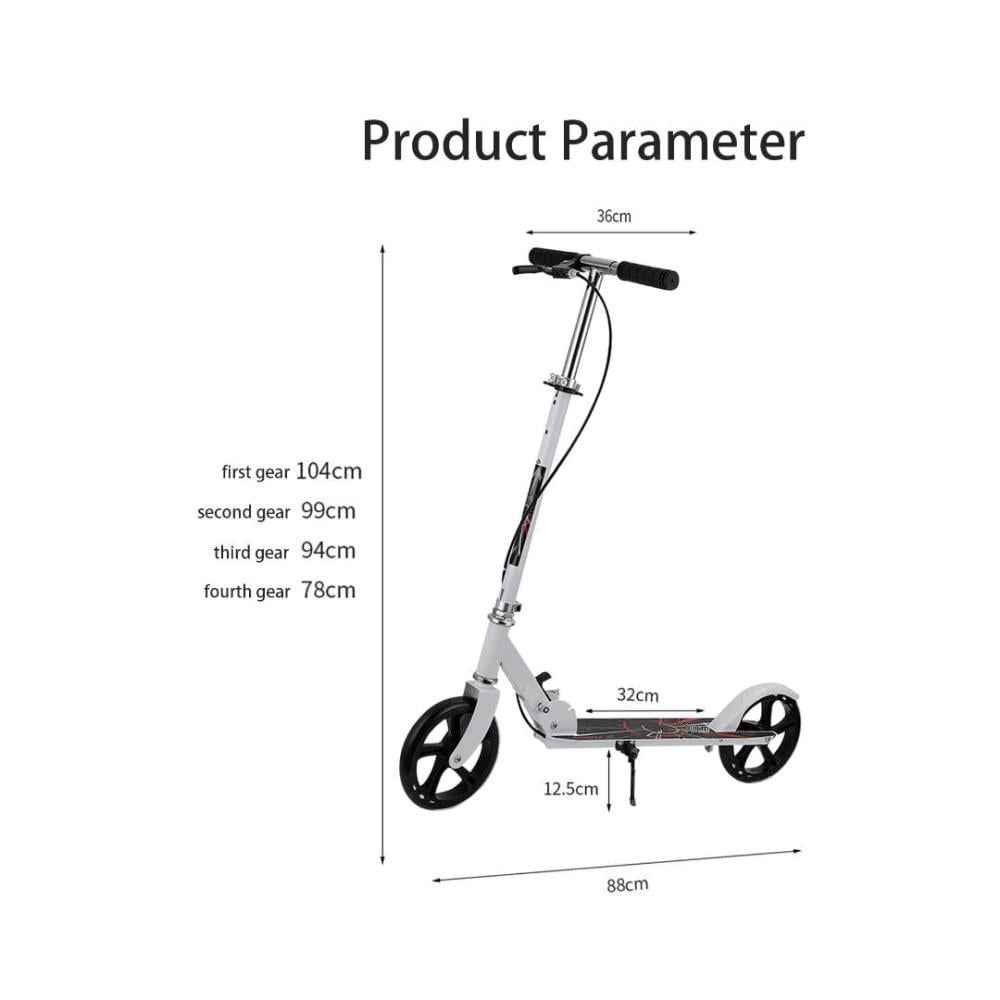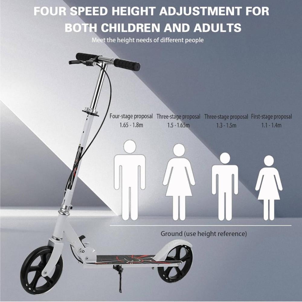 - قابلة لتعديل الارتفاع - يحتوي السكوتر على مقابض عريضة تتكيف مع 4 ارتفاعات مختلفة، وفقًا لارتفاع الراكب وراحته، حتى لا يفوت الدراجون طويل القامة متعة التصوير. التصميم مناسب للمراهقين الذين يبلغ طولهم 1.3-1.85 متر والذين تزيد أعمارهم عن 8 سنوات والمراهقين والبالغين.