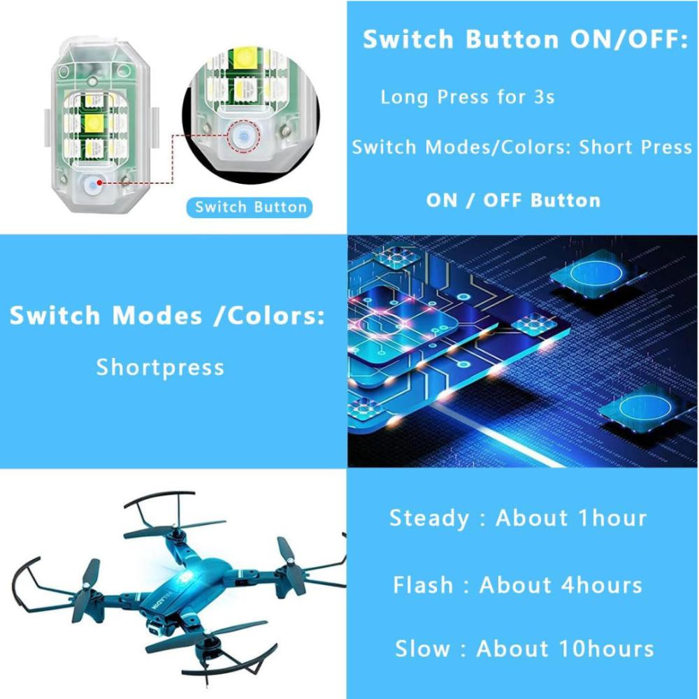 - عمر بطارية طويل لشحن USB - يمكن شحن واجهة USB والكمبيوتر والشاحن والباور بانك. يمكن لمصباح الطائرات اللاسلكي للتحكم عن بعد تبديل وضع الإضاءة عن بعد في غضون 7 أمتار من الطيران في الهواء. مصابيح LED وامضة مضادة للتصادم بسعة بطارية كبيرة، بطارية مدمجة 350 مللي أمبير/3.7 فولت + تصميم شحن USB، مصابيح الدراجة النارية الوامضة مع جهاز تحكم عن بعد لها عمر بطارية طويل. فلاش سريع يدوم لمدة 10 ساعات، ويستمر الوميض المنخفض لمدة 16 ساعة، مما يلبي احتياجات عشاق الهواء الطلق بالكامل.