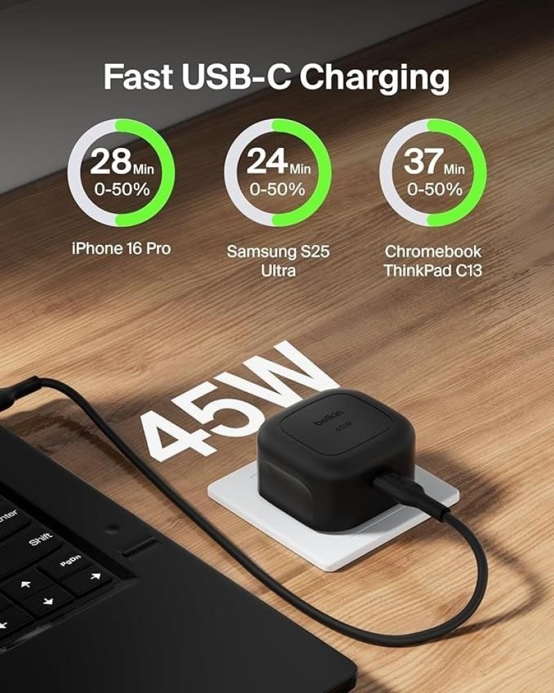 بيلكن - شاحن جداري بقوة 45 واط بمنفذ تايب سي مع سلك تايب سي - اسود