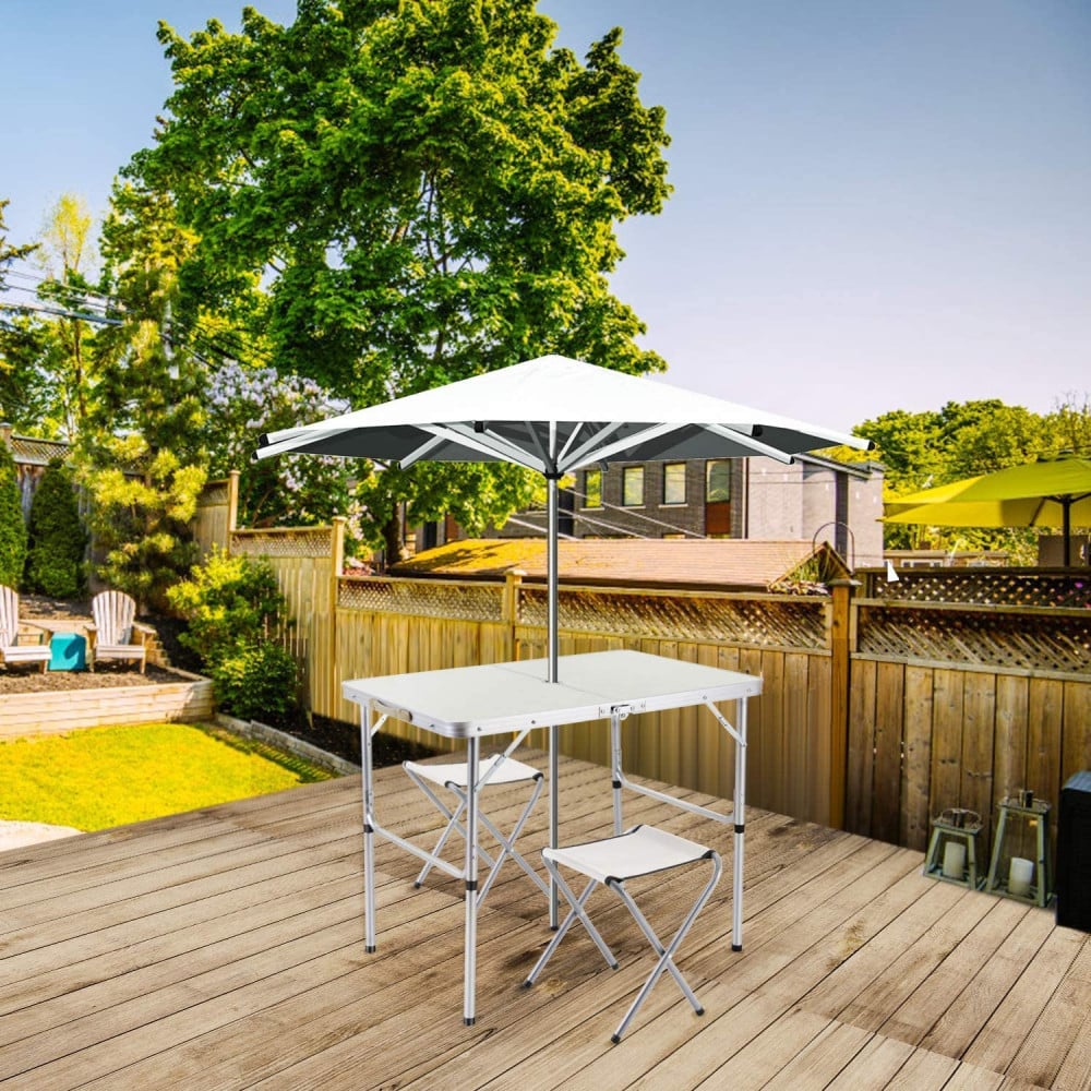طاولة نزهة قابلة للطي مع 4 مقاعد، فتحة مظلة من الألومنيوم قابلة للتعديل بارتفاع مع 4 مقاعد مناسبة، خفيفة الوزن وقابلة للحمل وارتفاع قابل للتعديل للتخي...