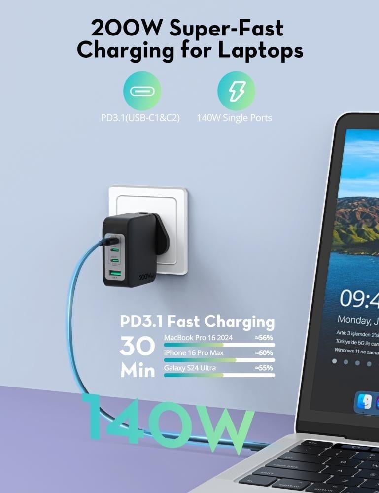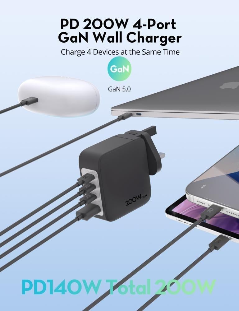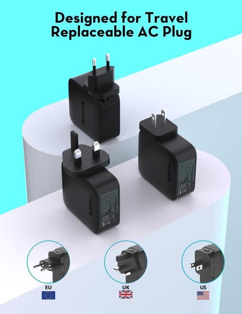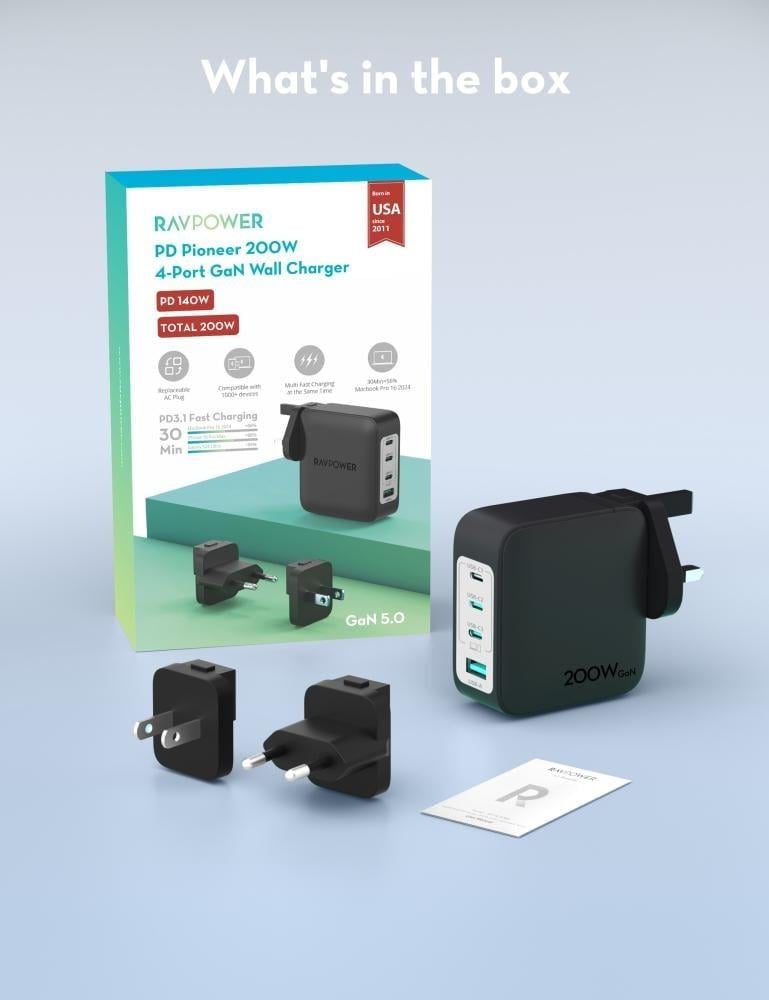 راف باور - شاحن متعدد للسفر بقوة 200 واط بمنفذ يو اس بي و ثلاث منافذ تايب سي - اسودوصف المنتج:شاحن السفر راف باور بقوة 200 واط هو الحل الأمثل للمسافري...