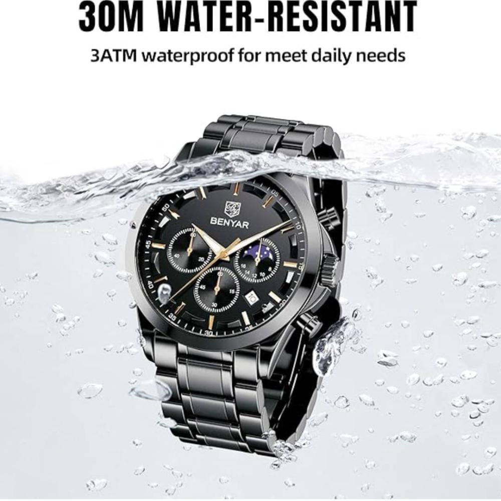 - الاحتفاظ بوقت دقيق - حركة الساعة الدقيقة ذات العلامة التجارية تجعل معدل دقتها أقل من ثانية واحدة في اليوم، وسوف تخبرك دائمًا بالوقت الدقيق في المناسبات أو العمل أو أي أماكن مهمة أخرى. تتميز ساعة انالوج بحركة كوارتز دقيقة للغاية إلى جانب وظيفة عرض التاريخ. كما أنها تحتوي على ثلاثة أقراص كرونوغراف تعمل كمؤقتات