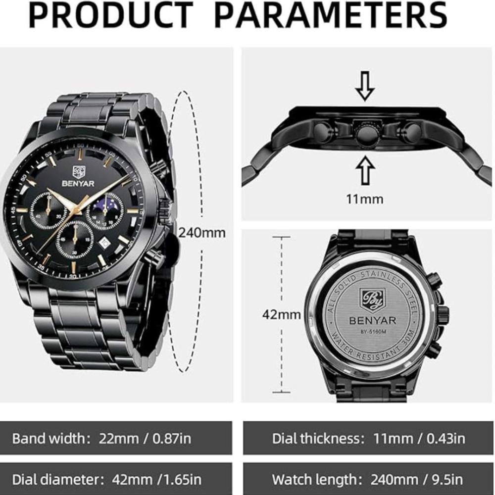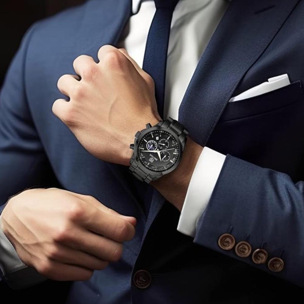 - ساعات عالية الجودة - إننا نقدم ساعات للرجال بحركة كوارتز عالية الجودة بنسبة 100% مع عرض انالوج وعرض للتاريخ بمتانة لا تصدق فيمكن أن تدوم مدى الحياة عند الحفاظ عليها بشكل جيد. ساعة كرونوغراف متعددة الوظائف مع ثلاثة أقراص وظيفية للثواني والدقائق والساعات