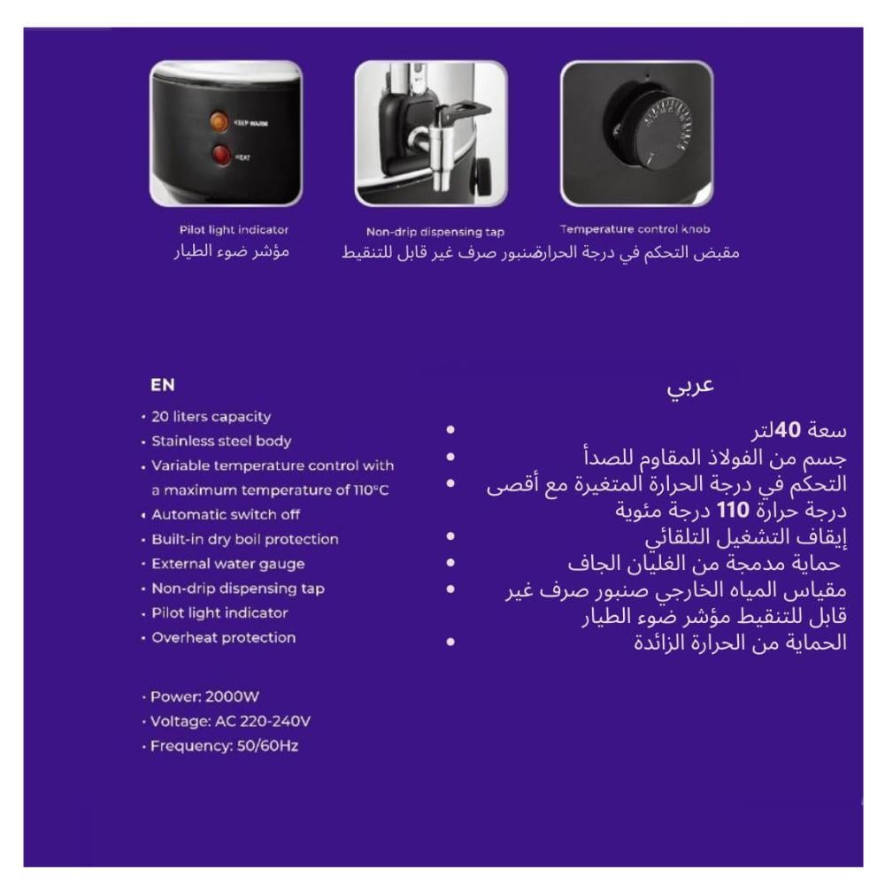لينكس غلاية مياه 40 لتر 2500 واطوصف المنتج :السعة: غلاية مياه بسعة كبيرة 40 لتر للاستخدام التجاري أو السكنيالطاقة: عنصر تسخين قوي 2500 واط لغليان فعال...