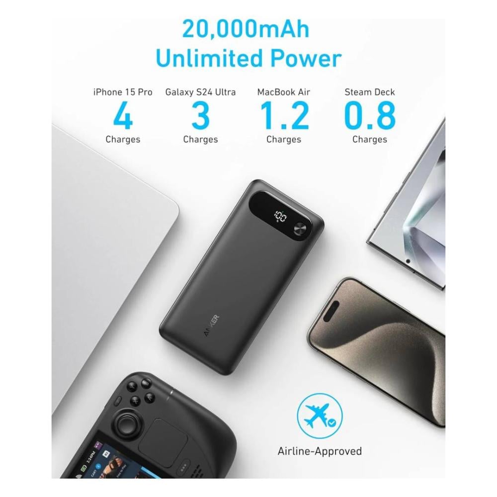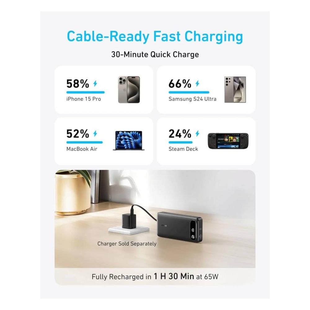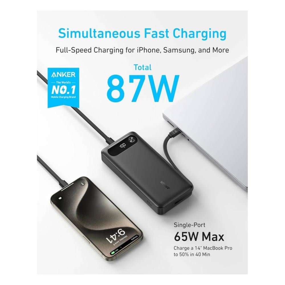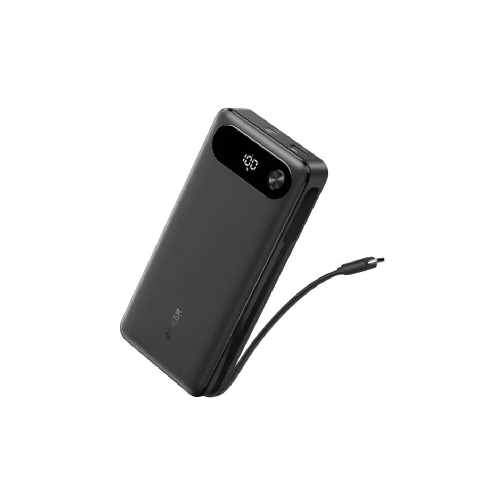 انكر - بطارية بسعة 20,000 ملي امبير بقوة 87 واط بمنفذ تايب سي ومنفذ يو اس بي مع سلك مدمج - اسود