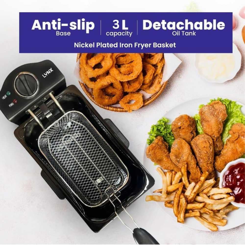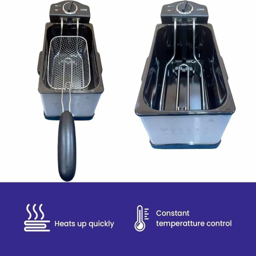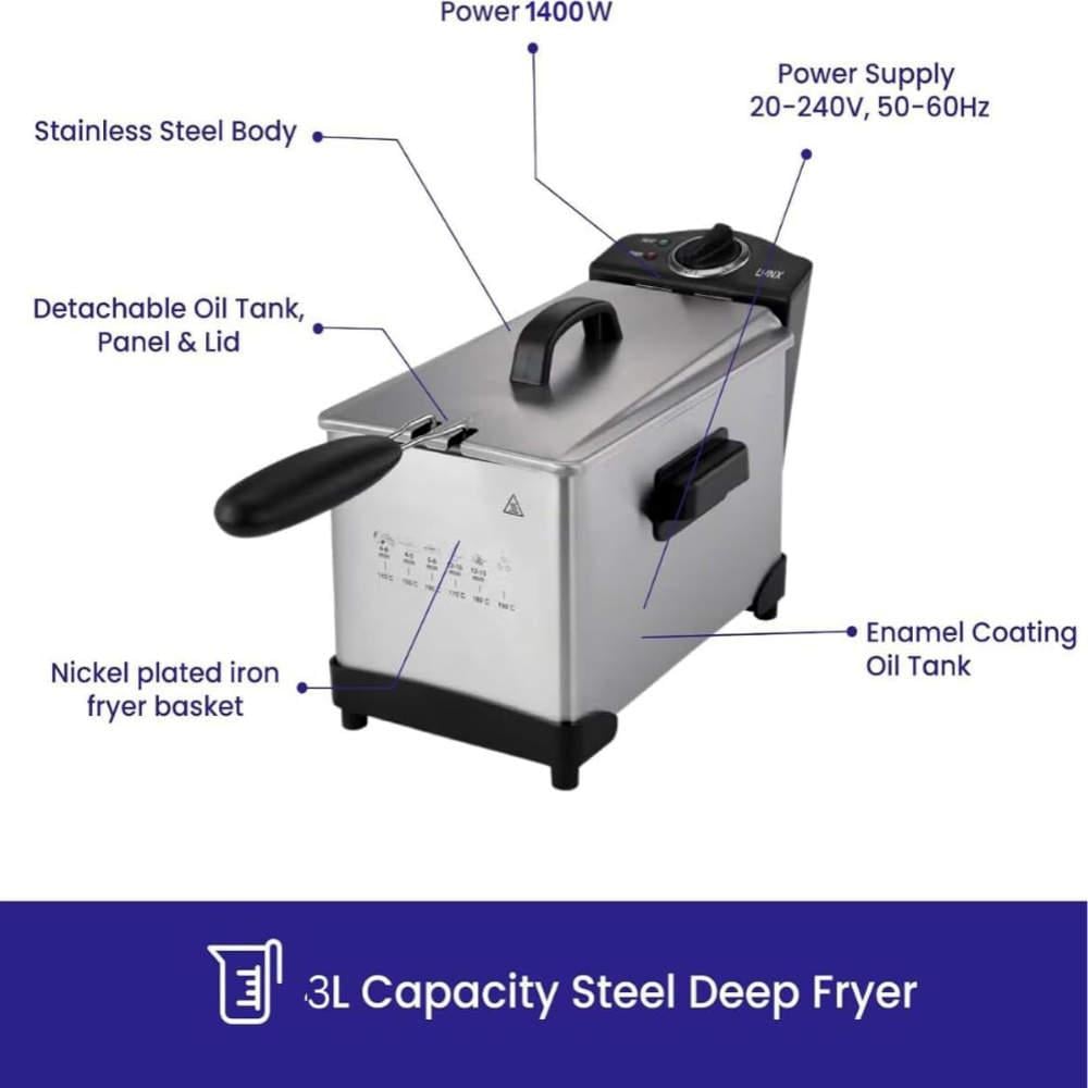 لينكس مقلاة عميقة من الستانلس ستيل 1400 واط مع سلة وغطاء ومقابضوصف المنتج :سعة الزيت 3 لترقاعدة مضادة للانزلاقخزان زيت مطلي بالميناترموستات قابل ...