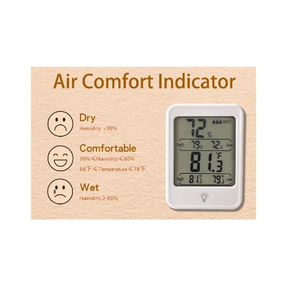- مؤشر ميزان حرارة للأماكن المغلقة مريح في الاستخدام: يعرض جهاز مراقبة درجة حرارة الغرفة ثلاث شاشات جاف/مريح/رطب، وذلك لإعلامك بصريًا بحالة الهواء الحالية، وضبط جهاز الترطيب بسرعة، وحماية صحتك بشكل أفضل