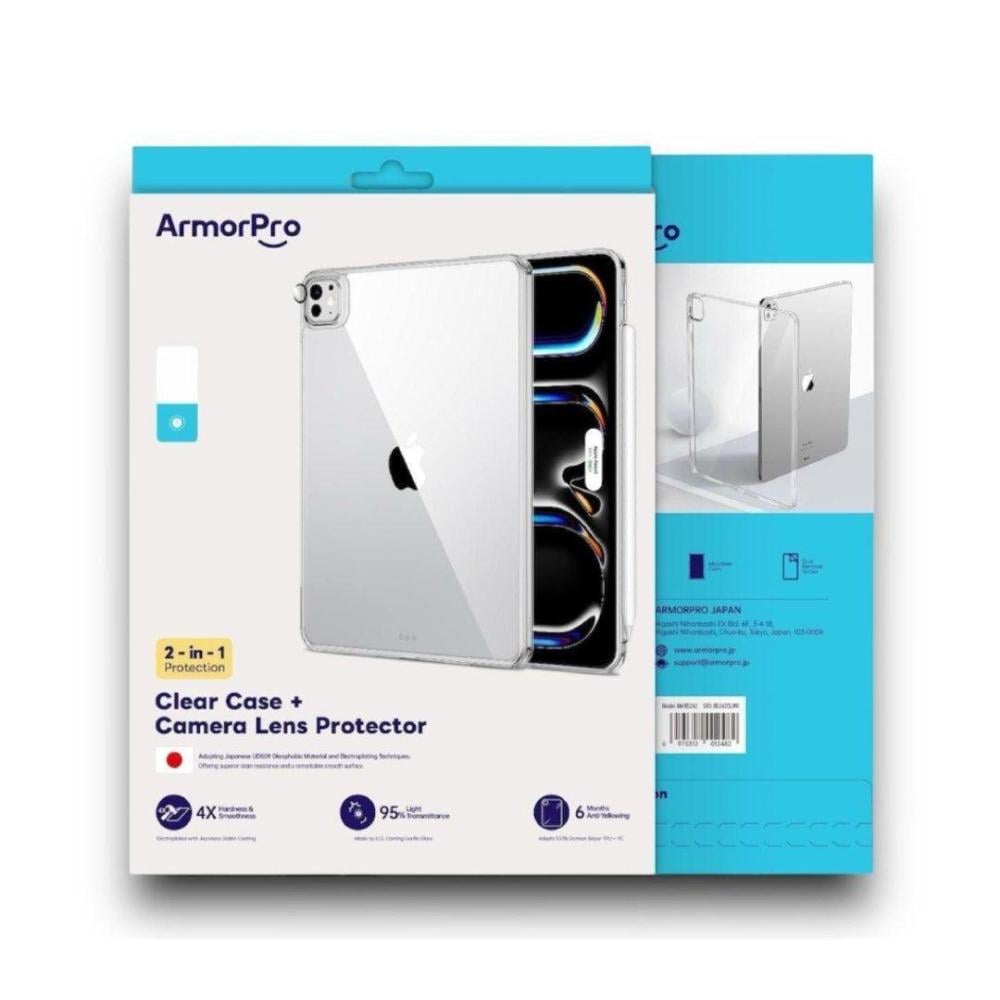 تقدّم حزمة ارمور برو 2 في 1 حلاً مثالياً لحماية الايباد برو 13 إنش، إذ تجمع بين غطاء شفاف متين وواقٍ للعدسة، لتوفير حماية شاملة للجهاز مع الحفاظ على مظهره الأنيق. يبرز الغطاء الشفاف التصميم العصري للايباد، فيما يحمي واقي العدسة الكاميرا من الخدوش والأتربة، مع ضمان جودة تصوير عالية.