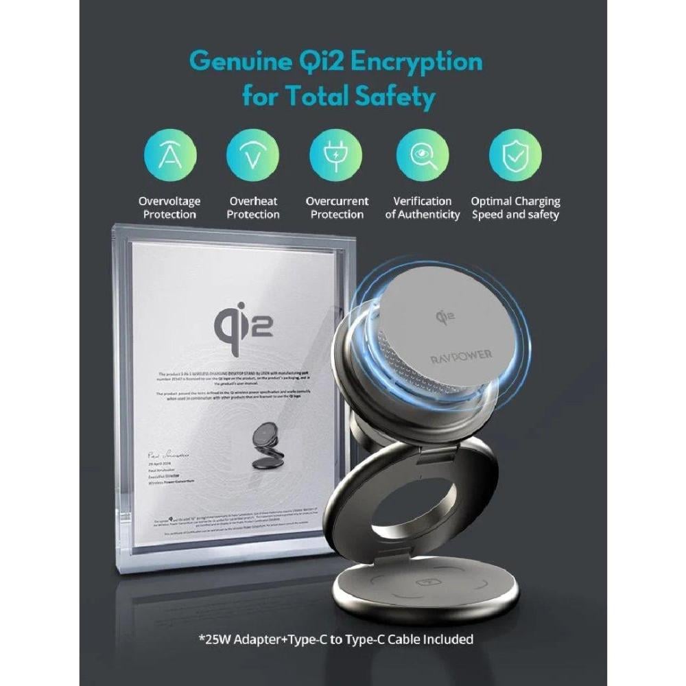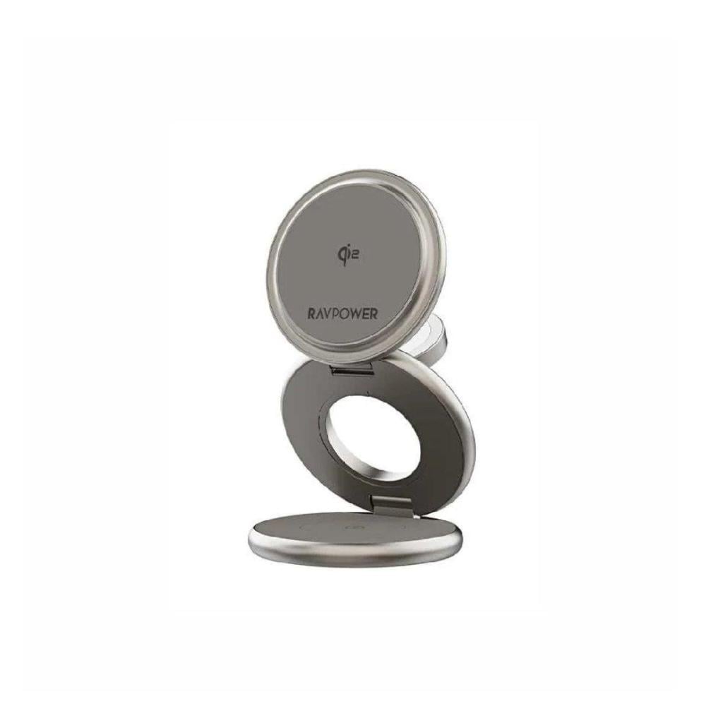 راف باور - منصة شحن بريميوم ستاند وشاحن ماج سيف بقوة 15 واط قابل للدوران 360 درجة 3 في 1 للجوال والسماعة والساعة - تيتانيوم