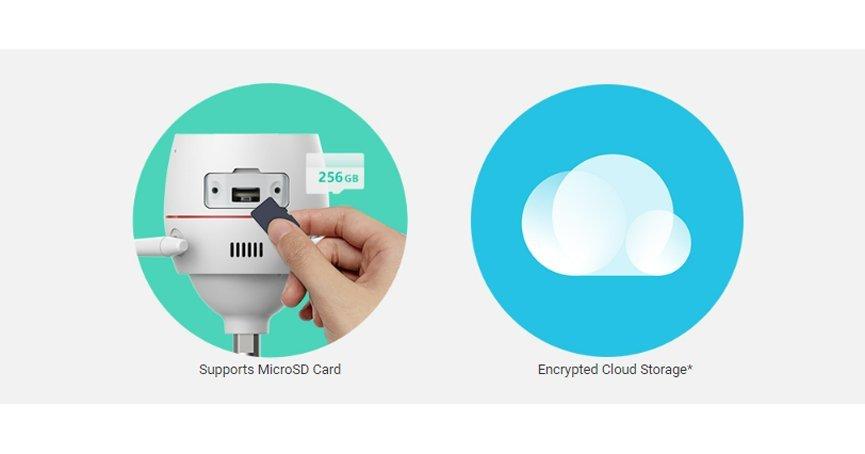 يمكنك تأمين مقاطع الفيديو المسجلة على بطاقة microSD داخلية تصل سعتها إلى 256 جيجابايت، أو الاشتراك في CloudPlay من EZVIZ لتخزين سحابي غير محدود ومشفر بالكامل.
