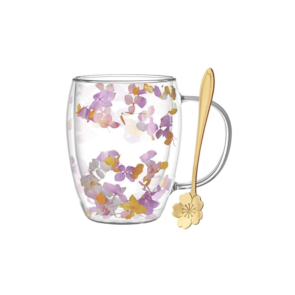 - هذا الكوب الزجاجي للقهوة والشاي بتصميم زهور لطيف، مليء بالزهور المجففة. يمكن للزهور المجففة أن تتأرجح وتتساقط بشكل جميل
