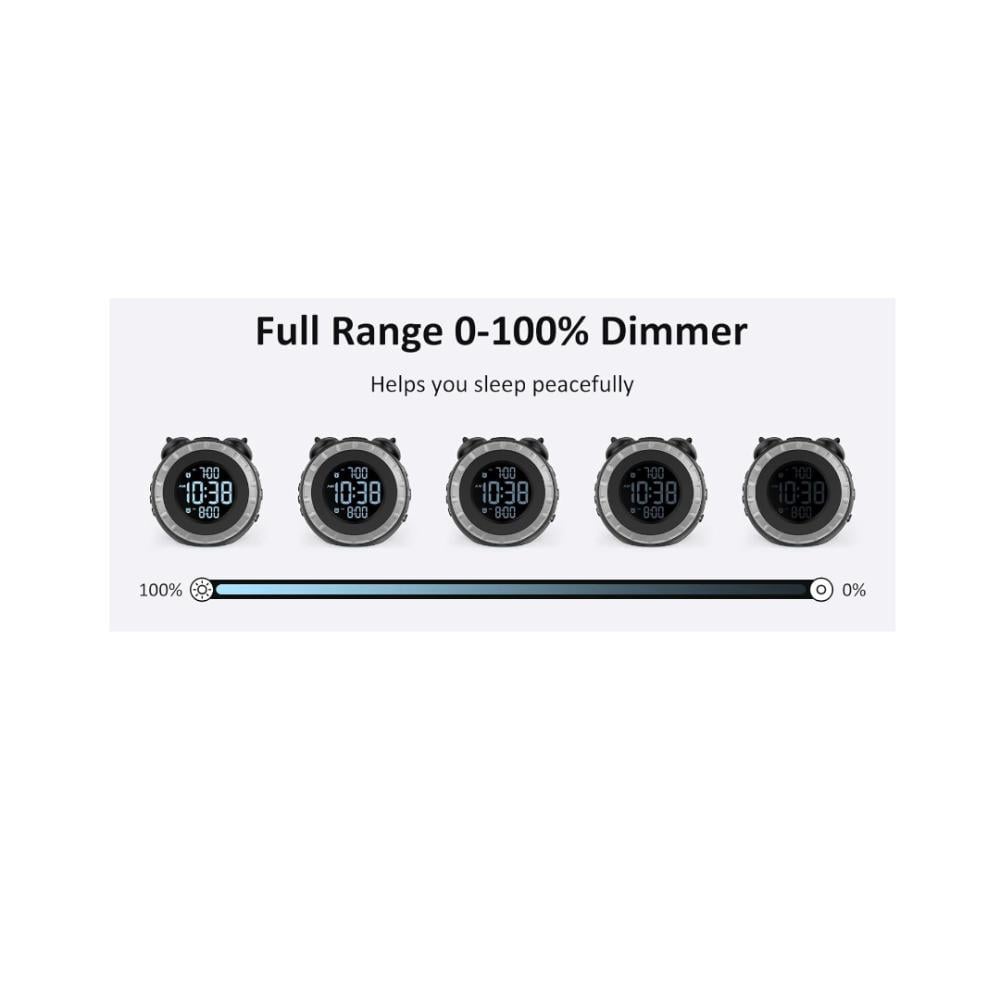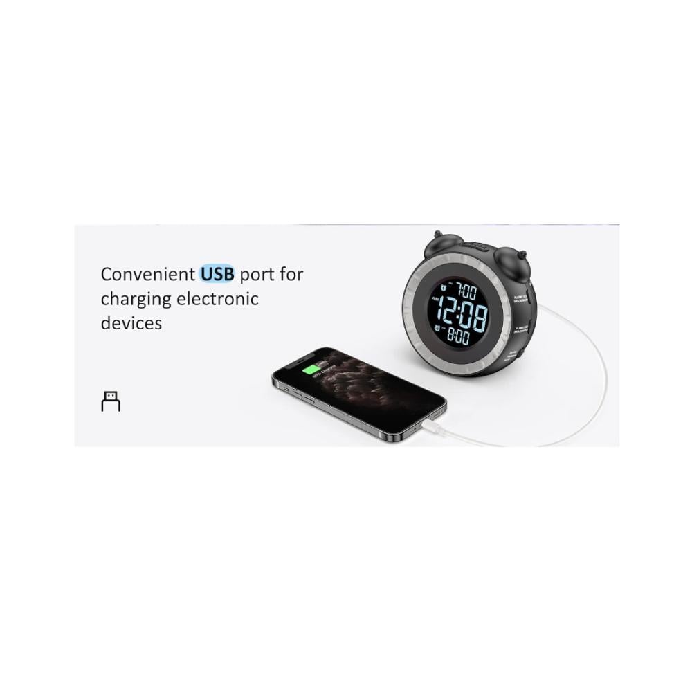 - منبه قابل للتخصيص - يتم التحكم في سطوع القرص الكلاسيكي وإمكانية تعديله من 0 إلى 100%. تُلبي أجهزة التنبيه المزدوجة حاجة أي شخص يتشارك السرير مع آخر في جدول صباحي مختلف. تتيح لك الغفوة 9 دقائق إضافية من النوم.