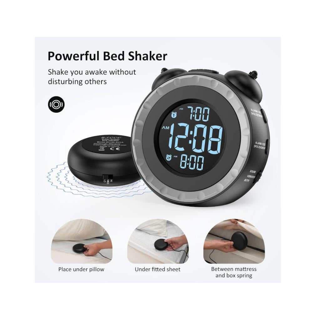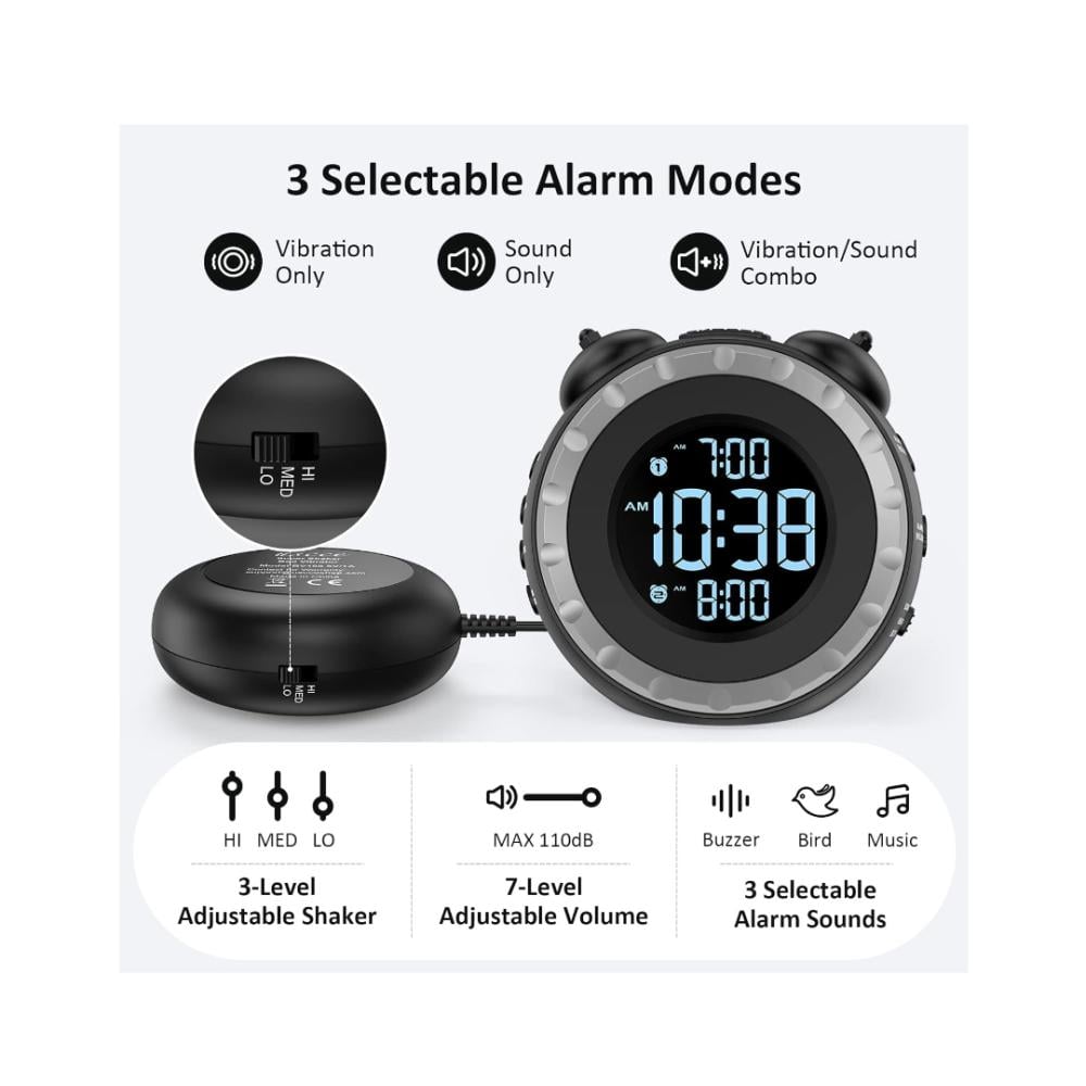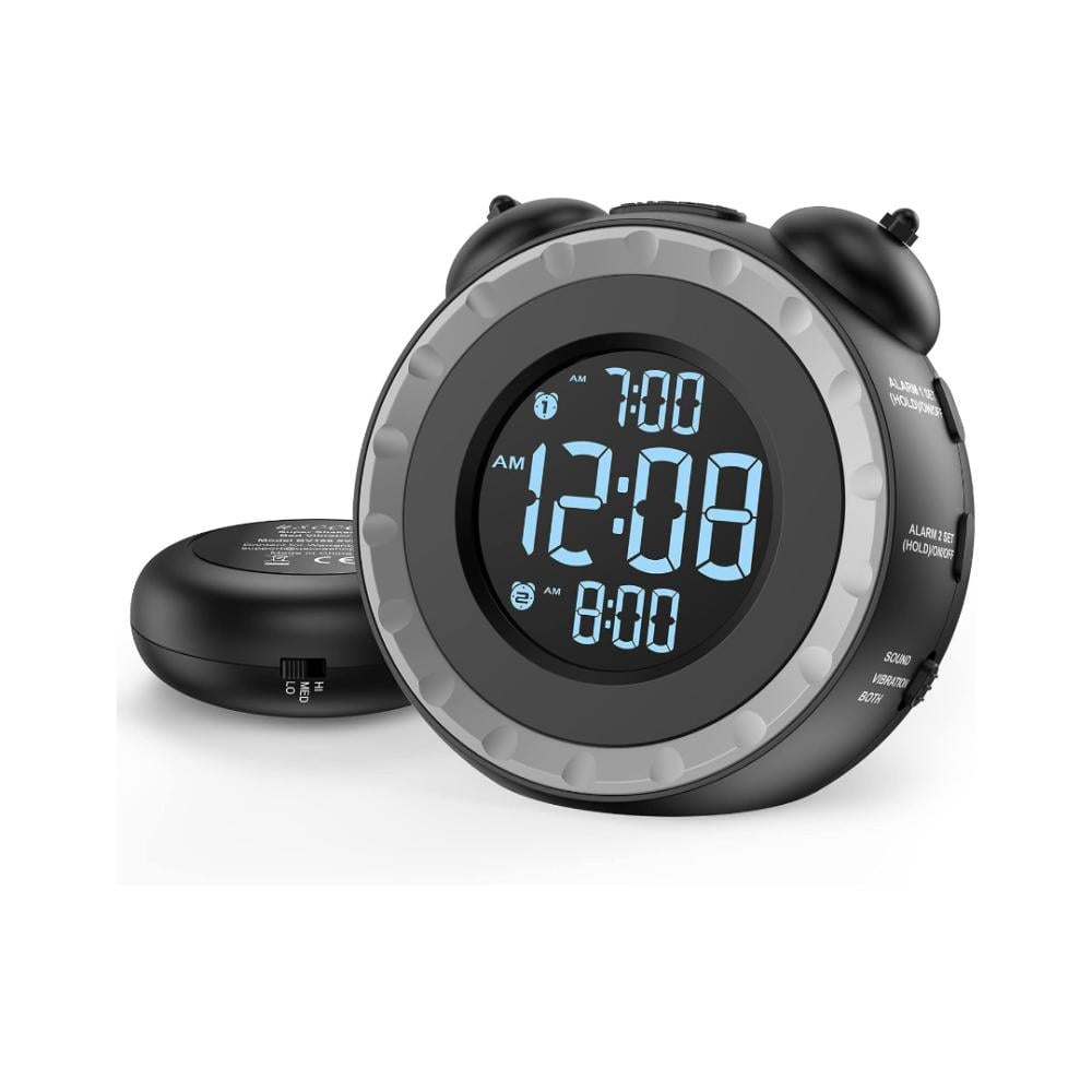 - ساعة صغيرة ولكنها قوية - إذا تطلب الأمر زلزالاً أو صفارة إنذار لإيقاظك، فهذه الساعة المصممة بشكل كلاسيكي هي بالضبط ما تبحث عنه. يعد الهزاز القابل للتعديل المزود بـ 3 مستويات مثاليًا لمن ينامون بعمق أو الذين يعانون من فقدان السمع. لديك أيضًا خيار دمج الاهتزاز مع صوت التنبيه المدمج (الجرس أو الطيور أو الموسيقى).